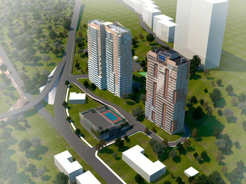 Здание представляет собой лаконичный вертикальный объём, состоящий из 26-ти надземных этажей и одного цокольного. И вписано в площадку со сложным рельефом, окружённую существующей застройкой со сло­жившимся образом и инфраструктурой. Главный фасад ориентирован на ул. Гоголя. Решение его внешнего вида продиктовано окружающей ситуацией. Раскрытие главного фасада происходит в динамике при движе­нии по прилегающим улицам и городским автотранспортным развязкам, что стало от­правной точкой в философии архитектурной идеи проектируемого здания. Ритм члене­ния главного фасада задаётся за счёт введения единой по стилистике конструкции огра­ждения балконов, зигзагом развивающейся по фасаду и визуально разделяющий объём здания на четыре части. В то же время балконы, расположенные один над другим на фа­саде здания, создают вертикальные членения уравновешивающие стремление вверх. Данный прием придает необычный вид зданию и делает фасады более вы­разительными. Завершает композицию использование остеклённой конструкции навесного фасада на верхних двух этажах и обрамление террасы на эксплуатируемой кровле конструктивным элементом большого табло с часовым механизмом.